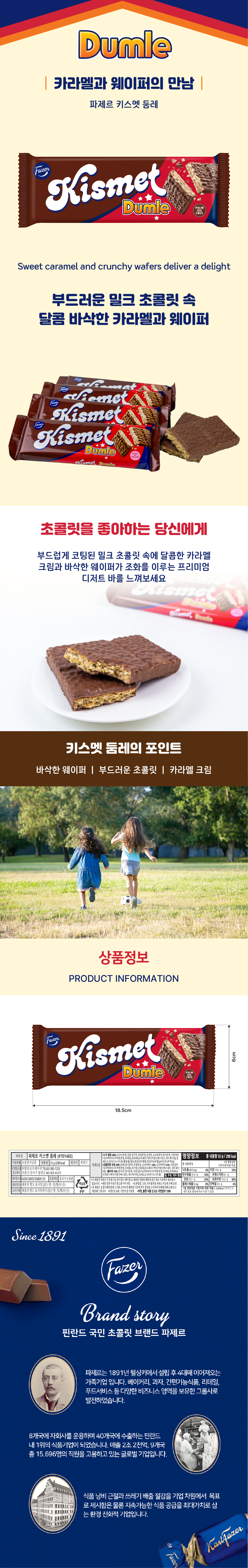 핀란드 대표 프리미엄 초콜릿 브랜드 파제르의 클래식 웨이퍼바로, 1974년 출시 이후 지금까지 꾸준히 사랑받고 있는 핀란드 국민 간식입니다. 바삭한 웨이퍼층 사이에 부드러운 코코아 크림을 채우고, 진한 밀크초콜릿으로 감싼 FAZER의 전통적인 초콜릿 기술이 담긴 시그니처 제품입니다.